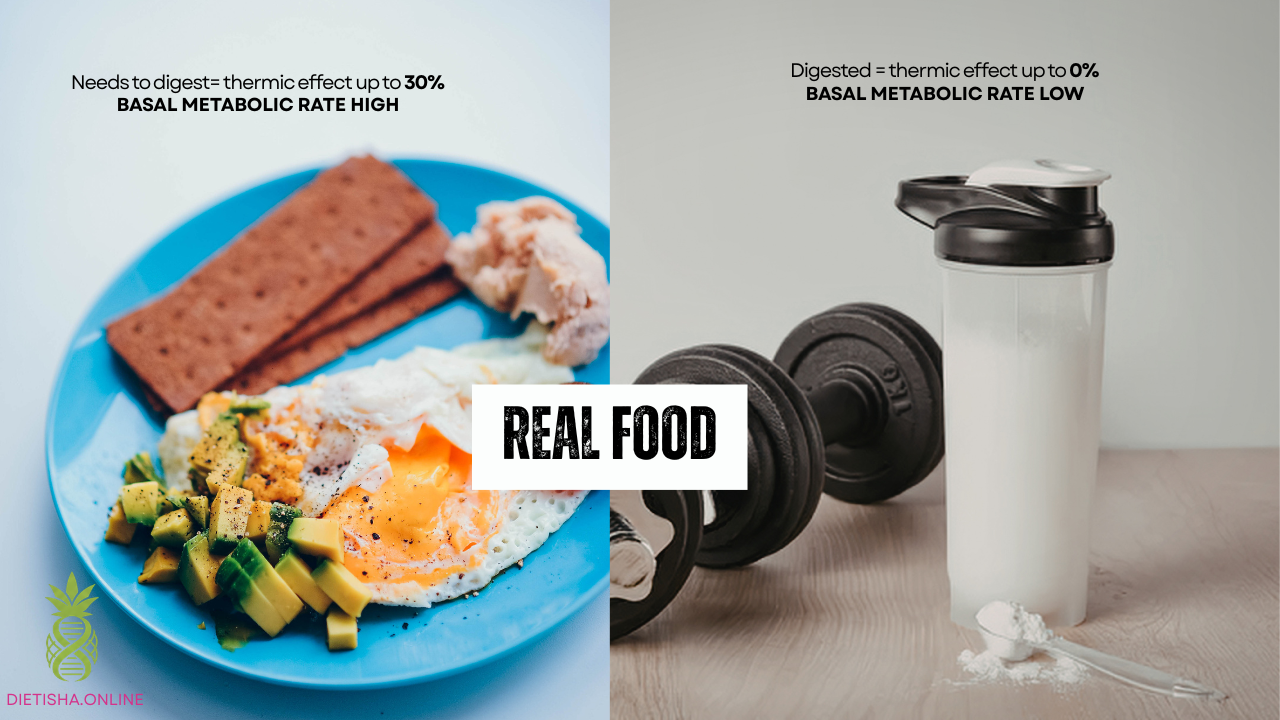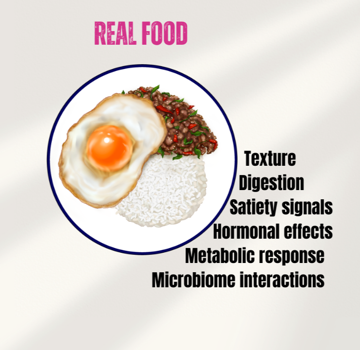 Your body spends energy breaking long protein chains into amino acids. This process increases thermic effect of food (TEF) — meaning digestion itself burns calories. Protein has the highest thermic effect of all macronutrients, often around 20–30% of its calories are used during digestion. That contributes to your basal metabolic rate and energy balance. it also slows absorption, supports satiety, and works with the gut in a way isolated powders often do not.